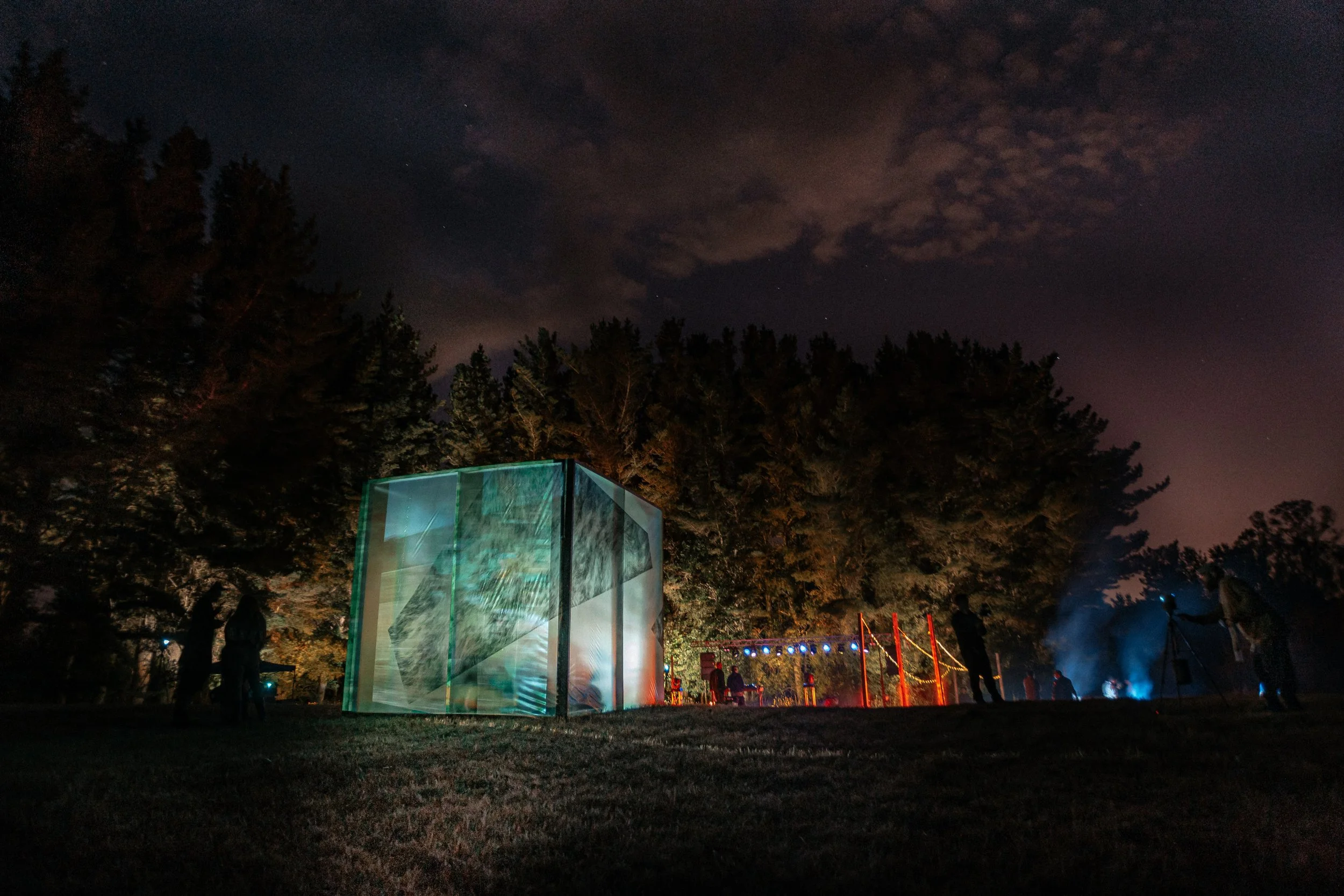 A site-specific, 3-meter translucent cube, 40-hour drawing, [4] 3-minute looping videos, and a 6-hour activation event —installed for 30 days. MATERIALS: china marker, greenhouse plastic, lumber